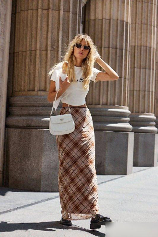 半裙侧边拼条格子布;防晒衬衫用半透明纱线织成小方格,太阳底下才隐约闪现;再偷懒就把丝巾绑包柄,"嘭"一下整身就有了记忆点。