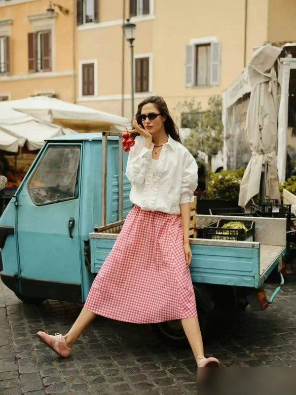 材质要玩对冲:硬挺竹节棉上衣+软塌雪纺半裙;规整格子纹+不规则下摆;上身学院下身海派——矛盾搭好了才叫会穿。