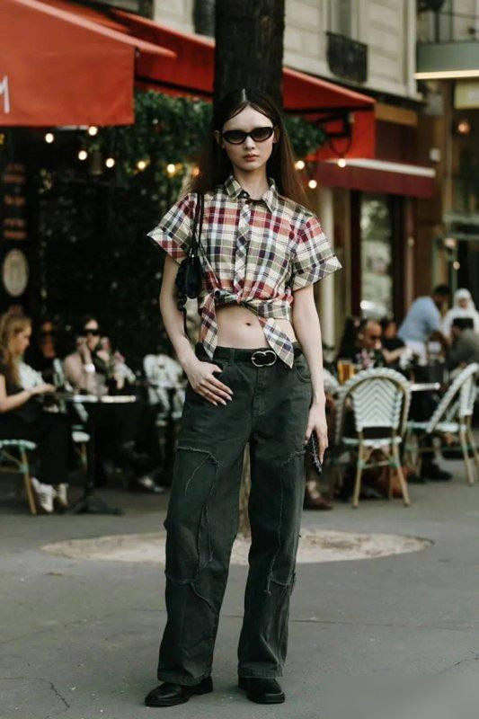 下摆打个结配高腰纸袋裤,露出一指宽的小格子边儿,遮肉显瘦还自带时间滤镜,"复古"俩字根本不用喊出口。